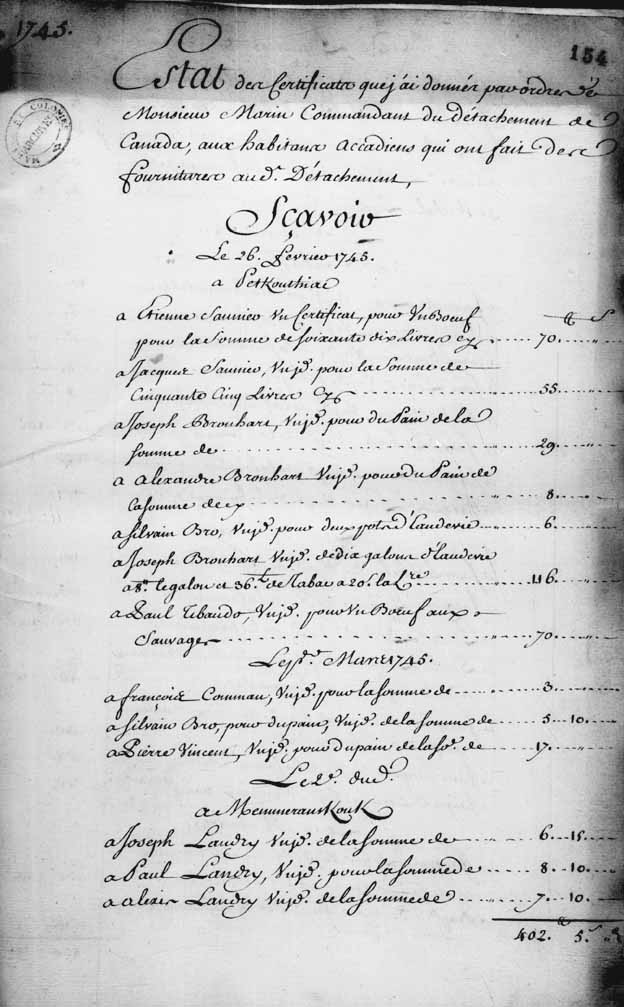 ont fait des fournitures audit détachement" - les noms des Acadiens qui ont fourni des biens ou des services y sont mentionnés: Étienne