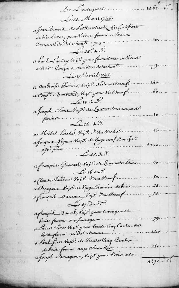 État des certificats donnés par Lignery, par ordre de Marin de La Malgue, "commandant du détachement de Canada, aux habitants Acadiens qui ont fait des fournitures audit détachement" - les noms des Acadiens qui ont fourni des biens ou des services y sont mentionnés: Étienne Saunier, Jacques Saunier, Joseph Brouhart, Alexandre Brouhart, Silvain Bro, Paul Thibaudo, François Comman, Pierre Vincent, Joseph Landry, Paul Landry, Alexis Landry, Pierre Ancoine, Jean Aucoin, Jean Benoist, Victor Le Blanc, Michel Lanoue, Jacques Leger, Pierre Amirau, Jean Bertran, Jean Leger, Paul Martin, Jean Dubois, Joseph Thibault, Jacques Labore, Pierre Bichard, Jacques Maurice, Jean Jacques, Jacques Devaux, Alexandre Brossart, Jean Babineau, T. Blanchard, Paul Doiron, Pierre Hébert, Charles Vignau, François Lapierre, Joseph Girouard, Pierre Bourg, Paul Olivier, François Cabanne, Pierre Doucet, Jacques Vignau, Jean Darois, Ambroise Poirier, Baptiste Bertrand, Joseph Suret, Michel Haché, François Girouard, Claude Tandau, Bergasse, François Assenant, François Bausel, Pierre Sire, Paul Sire, Joseph Bourgeois, Jean Le Sire fils, veuve Arsenaud, Michel Bourgeois, Jacques Bourgeois, Isabelle Arsenaud, Pierre Arsenaud, Pierre Sire fils, Jean Sire, Claude Poirier, veuve Oneil, Michel Sire, Honoré Bourgeois, veuve Cormier, Jacques Beaumont, Michel Girouard, Jean Quescy, Joseph Gravois, Michel Poirier père, Jean Mouton, Abraham Arsenaud, Charles Poirier, Charles Héon, François Arsenaud, Jacques Deaumont, Paul Leblanc, François Leblanc, Pierre Leblanc, Charles Dupuy, Jean Tranchens, François Grangé, Joseph Bordrau, René Aucoin, Antoine Landry, Pierre Girouard, Jacques Girouard, Charles Blanc, Joseph Bigean, Benjamin Landry, Jean Hébert, Pierre Landry, Charles Boudro, René Leblanc, veuve Benoist, Jean Trahens,