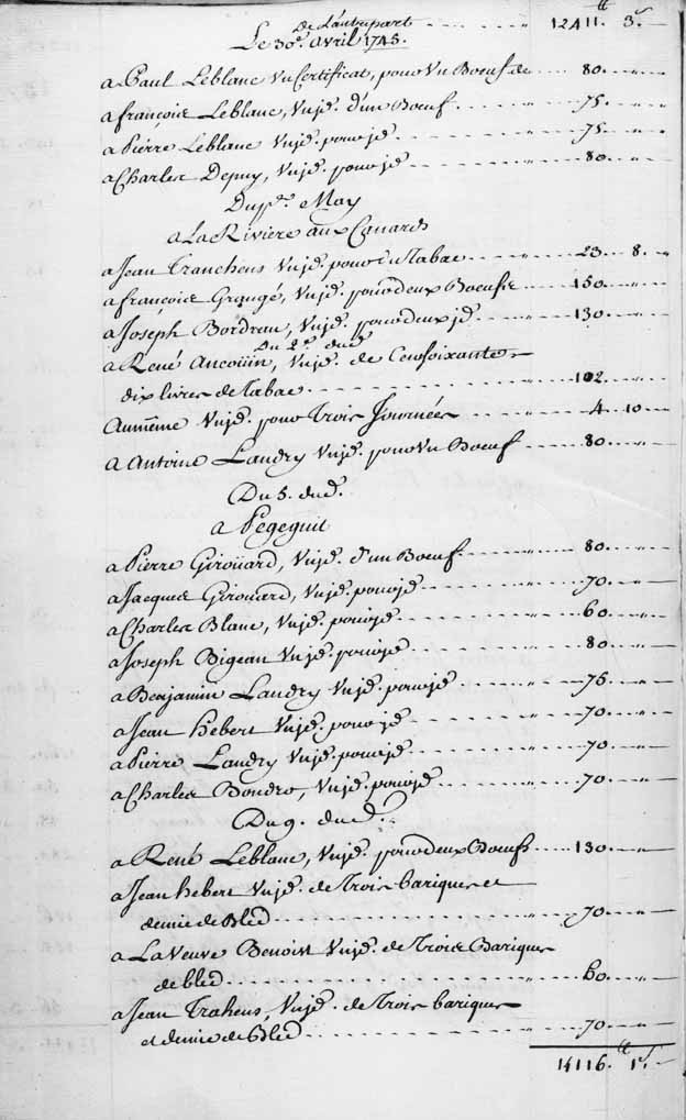 État des certificats donnés par Lignery, par ordre de Marin de La Malgue, "commandant du détachement de Canada, aux habitants Acadiens qui ont fait des fournitures audit détachement" - les noms des Acadiens qui ont fourni des biens ou des services y sont mentionnés: Étienne Saunier, Jacques Saunier, Joseph Brouhart, Alexandre Brouhart, Silvain Bro, Paul Thibaudo, François Comman, Pierre Vincent, Joseph Landry, Paul Landry, Alexis Landry, Pierre Ancoine, Jean Aucoin, Jean Benoist, Victor Le Blanc, Michel Lanoue, Jacques Leger, Pierre Amirau, Jean Bertran, Jean Leger, Paul Martin, Jean Dubois, Joseph Thibault, Jacques Labore, Pierre Bichard, Jacques Maurice, Jean Jacques, Jacques Devaux, Alexandre Brossart, Jean Babineau, T. Blanchard, Paul Doiron, Pierre Hébert, Charles Vignau, François Lapierre, Joseph Girouard, Pierre Bourg, Paul Olivier, François Cabanne, Pierre Doucet, Jacques Vignau, Jean Darois, Ambroise Poirier, Baptiste Bertrand, Joseph Suret, Michel Haché, François Girouard, Claude Tandau, Bergasse, François Assenant, François Bausel, Pierre Sire, Paul Sire, Joseph Bourgeois, Jean Le Sire fils, veuve Arsenaud, Michel Bourgeois, Jacques Bourgeois, Isabelle Arsenaud, Pierre Arsenaud, Pierre Sire fils, Jean Sire, Claude Poirier, veuve Oneil, Michel Sire, Honoré Bourgeois, veuve Cormier, Jacques Beaumont, Michel Girouard, Jean Quescy, Joseph Gravois, Michel Poirier père, Jean Mouton, Abraham Arsenaud, Charles Poirier, Charles Héon, François Arsenaud, Jacques Deaumont, Paul Leblanc, François Leblanc, Pierre Leblanc, Charles Dupuy, Jean Tranchens, François Grangé, Joseph Bordrau, René Aucoin, Antoine Landry, Pierre Girouard, Jacques Girouard, Charles Blanc, Joseph Bigean, Benjamin Landry, Jean Hébert, Pierre Landry, Charles Boudro, René Leblanc, veuve Benoist, Jean Trahens,