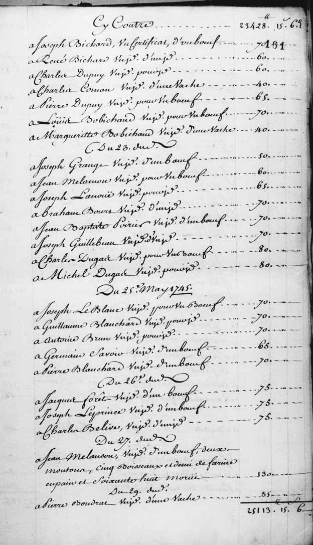 État des certificats donnés par Lignery, par ordre de Marin de La Malgue, "commandant du détachement de Canada, aux habitants Acadiens qui ont fait des fournitures audit détachement" - les noms des Acadiens qui ont fourni des biens ou des services y sont mentionnés: Étienne Saunier, Jacques Saunier, Joseph Brouhart, Alexandre Brouhart, Silvain Bro, Paul Thibaudo, François Comman, Pierre Vincent, Joseph Landry, Paul Landry, Alexis Landry, Pierre Ancoine, Jean Aucoin, Jean Benoist, Victor Le Blanc, Michel Lanoue, Jacques Leger, Pierre Amirau, Jean Bertran, Jean Leger, Paul Martin, Jean Dubois, Joseph Thibault, Jacques Labore, Pierre Bichard, Jacques Maurice, Jean Jacques, Jacques Devaux, Alexandre Brossart, Jean Babineau, T. Blanchard, Paul Doiron, Pierre Hébert, Charles Vignau, François Lapierre, Joseph Girouard, Pierre Bourg, Paul Olivier, François Cabanne, Pierre Doucet, Jacques Vignau, Jean Darois, Ambroise Poirier, Baptiste Bertrand, Joseph Suret, Michel Haché, François Girouard, Claude Tandau, Bergasse, François Assenant, François Bausel, Pierre Sire, Paul Sire, Joseph Bourgeois, Jean Le Sire fils, veuve Arsenaud, Michel Bourgeois, Jacques Bourgeois, Isabelle Arsenaud, Pierre Arsenaud, Pierre Sire fils, Jean Sire, Claude Poirier, veuve Oneil, Michel Sire, Honoré Bourgeois, veuve Cormier, Jacques Beaumont, Michel Girouard, Jean Quescy, Joseph Gravois, Michel Poirier père, Jean Mouton, Abraham Arsenaud, Charles Poirier, Charles Héon, François Arsenaud, Jacques Deaumont, Paul Leblanc, François Leblanc, Pierre Leblanc, Charles Dupuy, Jean Tranchens, François Grangé, Joseph Bordrau, René Aucoin, Antoine Landry, Pierre Girouard, Jacques Girouard, Charles Blanc, Joseph Bigean, Benjamin Landry, Jean Hébert, Pierre Landry, Charles Boudro, René Leblanc, veuve Benoist, Jean Trahens,