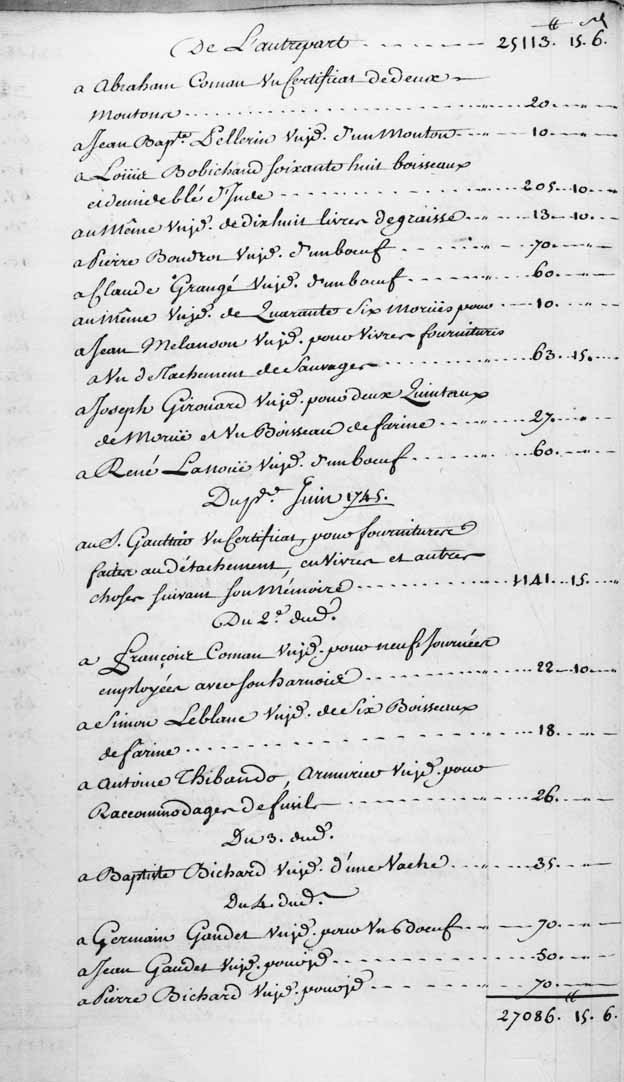 État des certificats donnés par Lignery, par ordre de Marin de La Malgue, "commandant du détachement de Canada, aux habitants Acadiens qui ont fait des fournitures audit détachement" - les noms des Acadiens qui ont fourni des biens ou des services y sont mentionnés: Étienne Saunier, Jacques Saunier, Joseph Brouhart, Alexandre Brouhart, Silvain Bro, Paul Thibaudo, François Comman, Pierre Vincent, Joseph Landry, Paul Landry, Alexis Landry, Pierre Ancoine, Jean Aucoin, Jean Benoist, Victor Le Blanc, Michel Lanoue, Jacques Leger, Pierre Amirau, Jean Bertran, Jean Leger, Paul Martin, Jean Dubois, Joseph Thibault, Jacques Labore, Pierre Bichard, Jacques Maurice, Jean Jacques, Jacques Devaux, Alexandre Brossart, Jean Babineau, T. Blanchard, Paul Doiron, Pierre Hébert, Charles Vignau, François Lapierre, Joseph Girouard, Pierre Bourg, Paul Olivier, François Cabanne, Pierre Doucet, Jacques Vignau, Jean Darois, Ambroise Poirier, Baptiste Bertrand, Joseph Suret, Michel Haché, François Girouard, Claude Tandau, Bergasse, François Assenant, François Bausel, Pierre Sire, Paul Sire, Joseph Bourgeois, Jean Le Sire fils, veuve Arsenaud, Michel Bourgeois, Jacques Bourgeois, Isabelle Arsenaud, Pierre Arsenaud, Pierre Sire fils, Jean Sire, Claude Poirier, veuve Oneil, Michel Sire, Honoré Bourgeois, veuve Cormier, Jacques Beaumont, Michel Girouard, Jean Quescy, Joseph Gravois, Michel Poirier père, Jean Mouton, Abraham Arsenaud, Charles Poirier, Charles Héon, François Arsenaud, Jacques Deaumont, Paul Leblanc, François Leblanc, Pierre Leblanc, Charles Dupuy, Jean Tranchens, François Grangé, Joseph Bordrau, René Aucoin, Antoine Landry, Pierre Girouard, Jacques Girouard, Charles Blanc, Joseph Bigean, Benjamin Landry, Jean Hébert, Pierre Landry, Charles Boudro, René Leblanc, veuve Benoist, Jean Trahens,