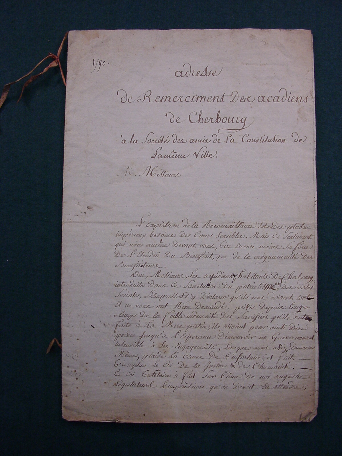 Lettre 1790 - Adresse de remerciement des Acadiens de Cherbourg