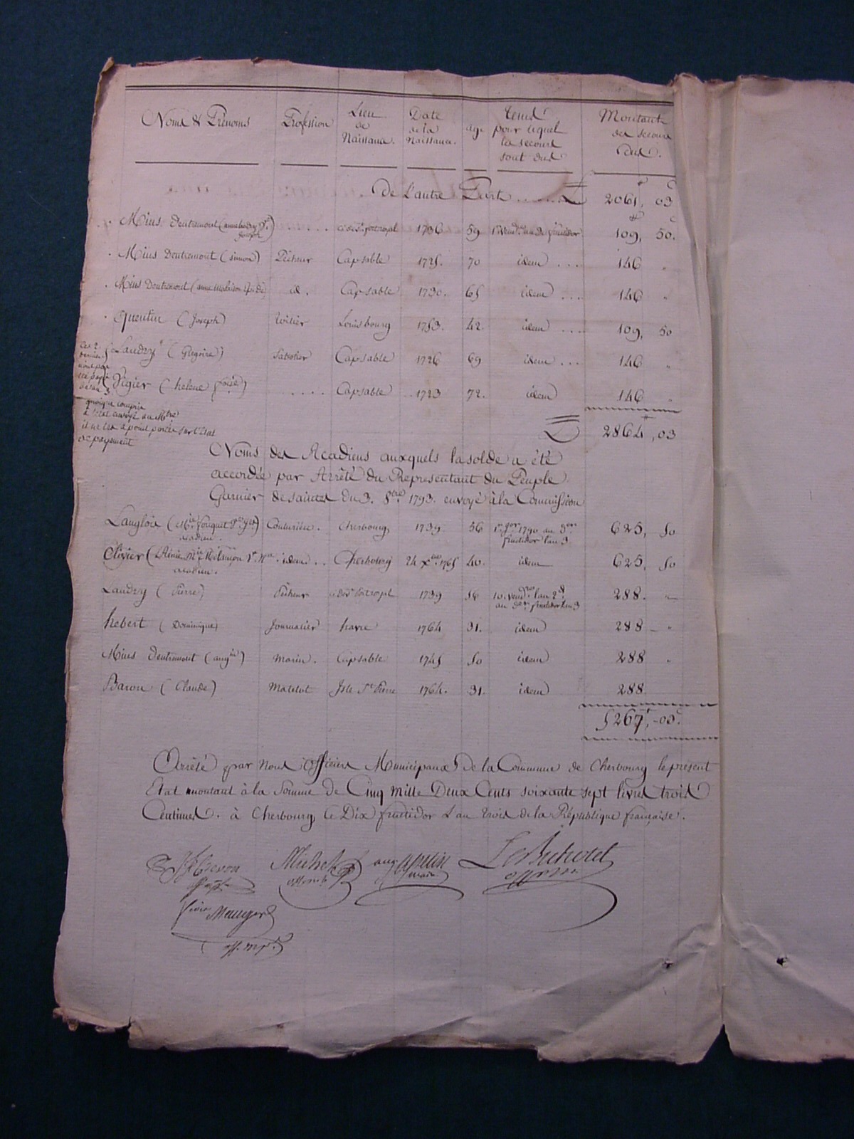 Arrêté par nous officiers municipaux de la commune de Cherbourg le présent état montant à la somme de .... à Cherbourg le dix fructidor l'an trois de la République française.