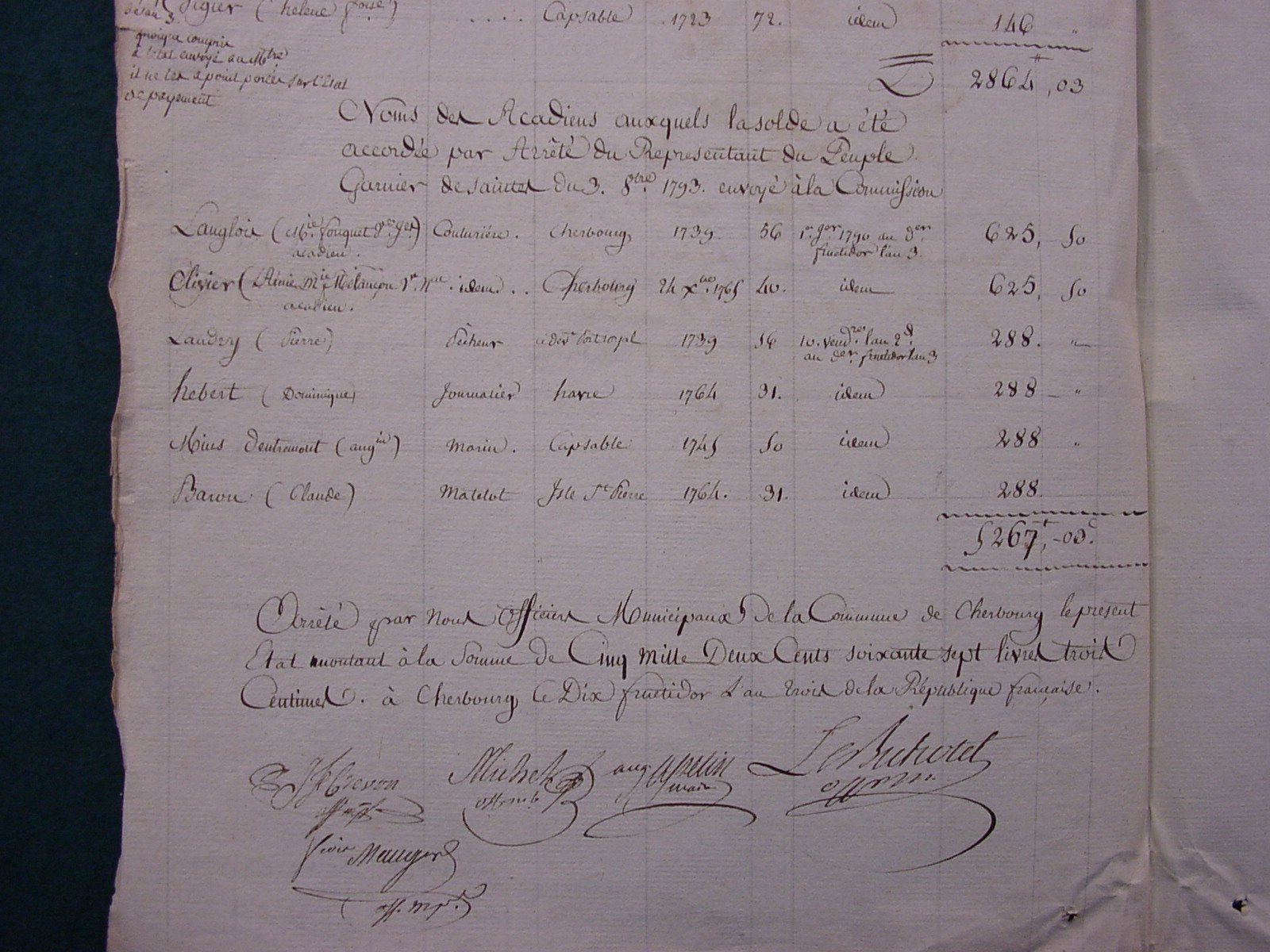 Arrêté par nous officiers municipaux de la commune de Cherbourg le présent état montant à la somme de .... à Cherbourg le dix fructidor l'an trois de la République française.