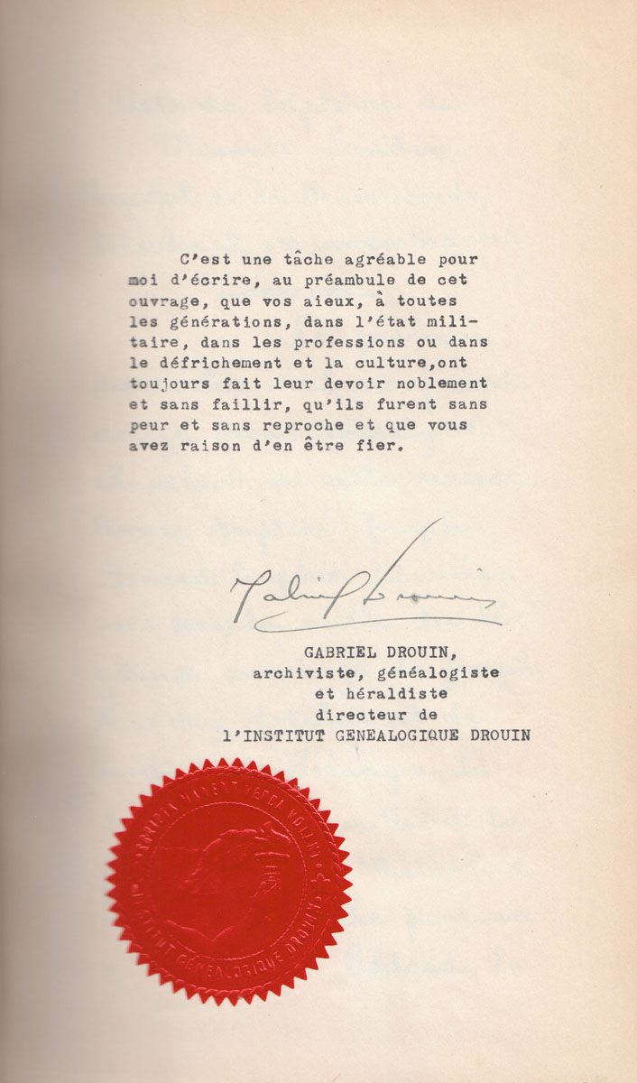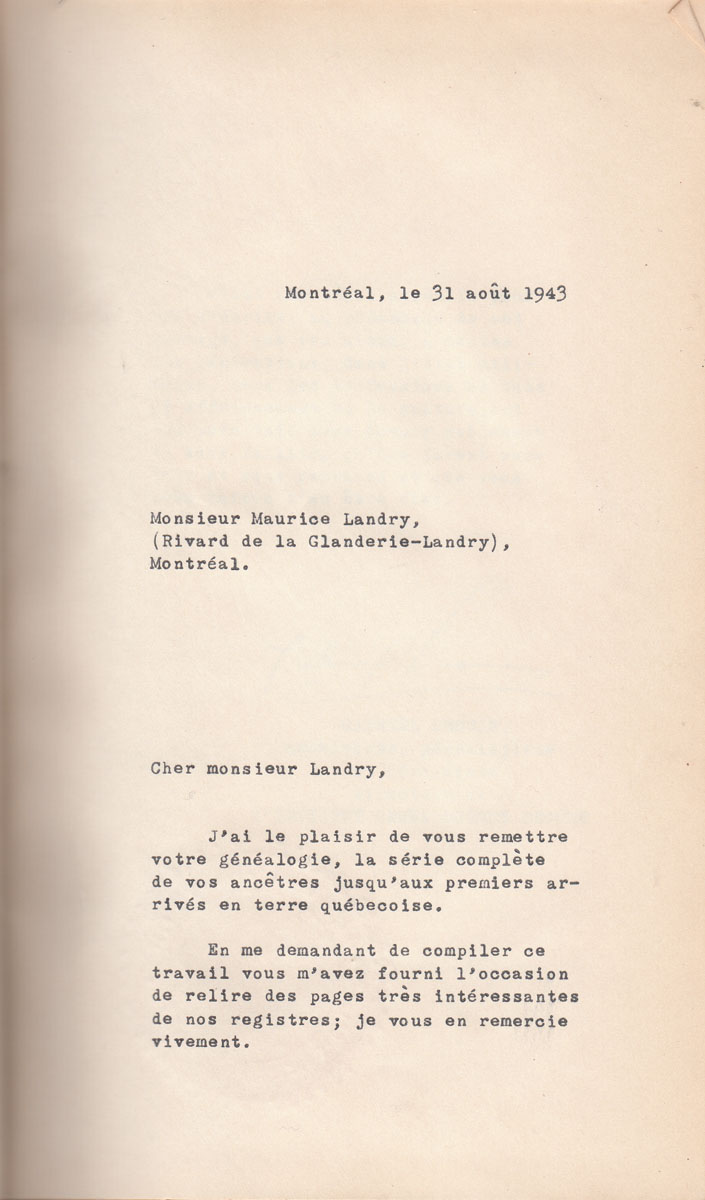 Exemple de document produit par l'Institut Drouin. Ici la généalogie de Maurice Landry dit Laglanderie produite en 1943.