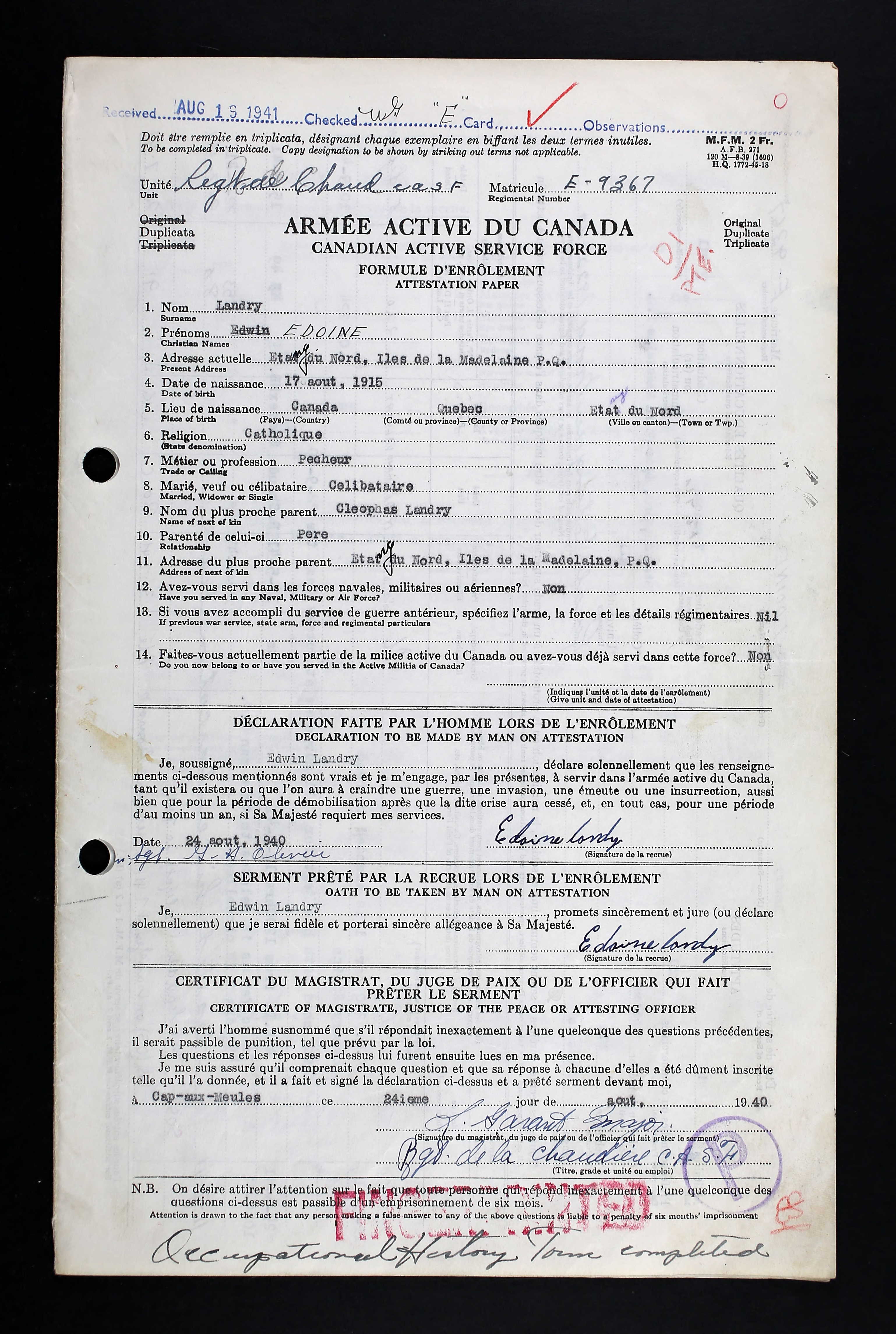 | Formule d'enrôlement, 24 aout 1940,