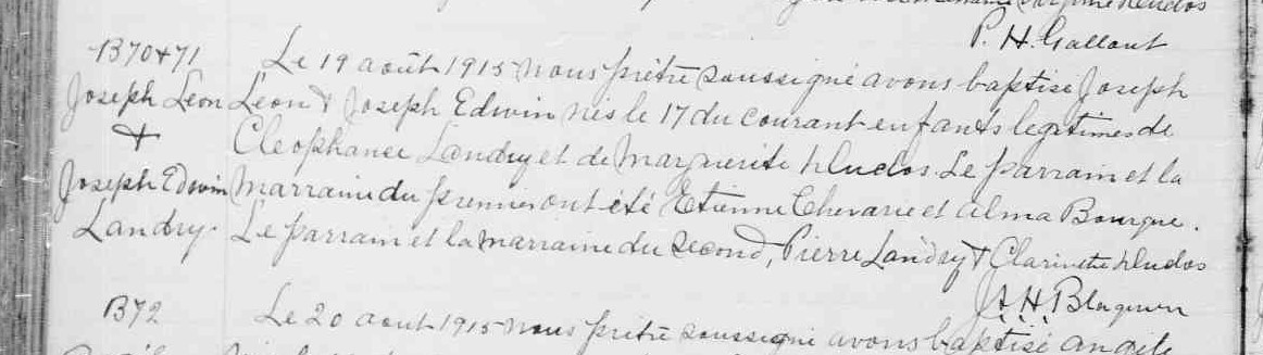 | Registre de baptême, 19 aout 1915, L'Étang-du-Nord,