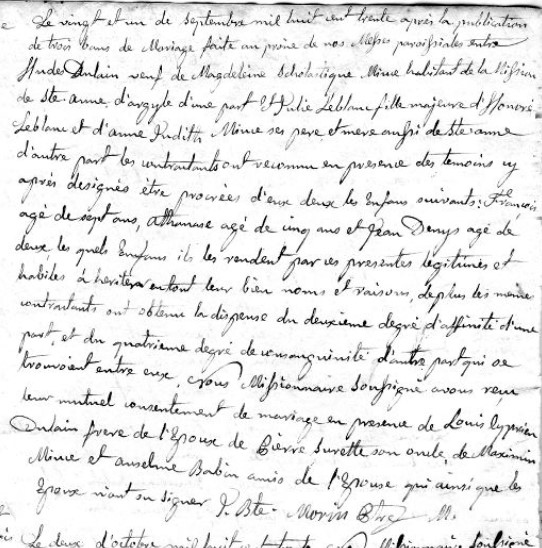 Au baptême de Jean Denis, le 27 mai 1828, " enfant naturel de Julie LeBlanc