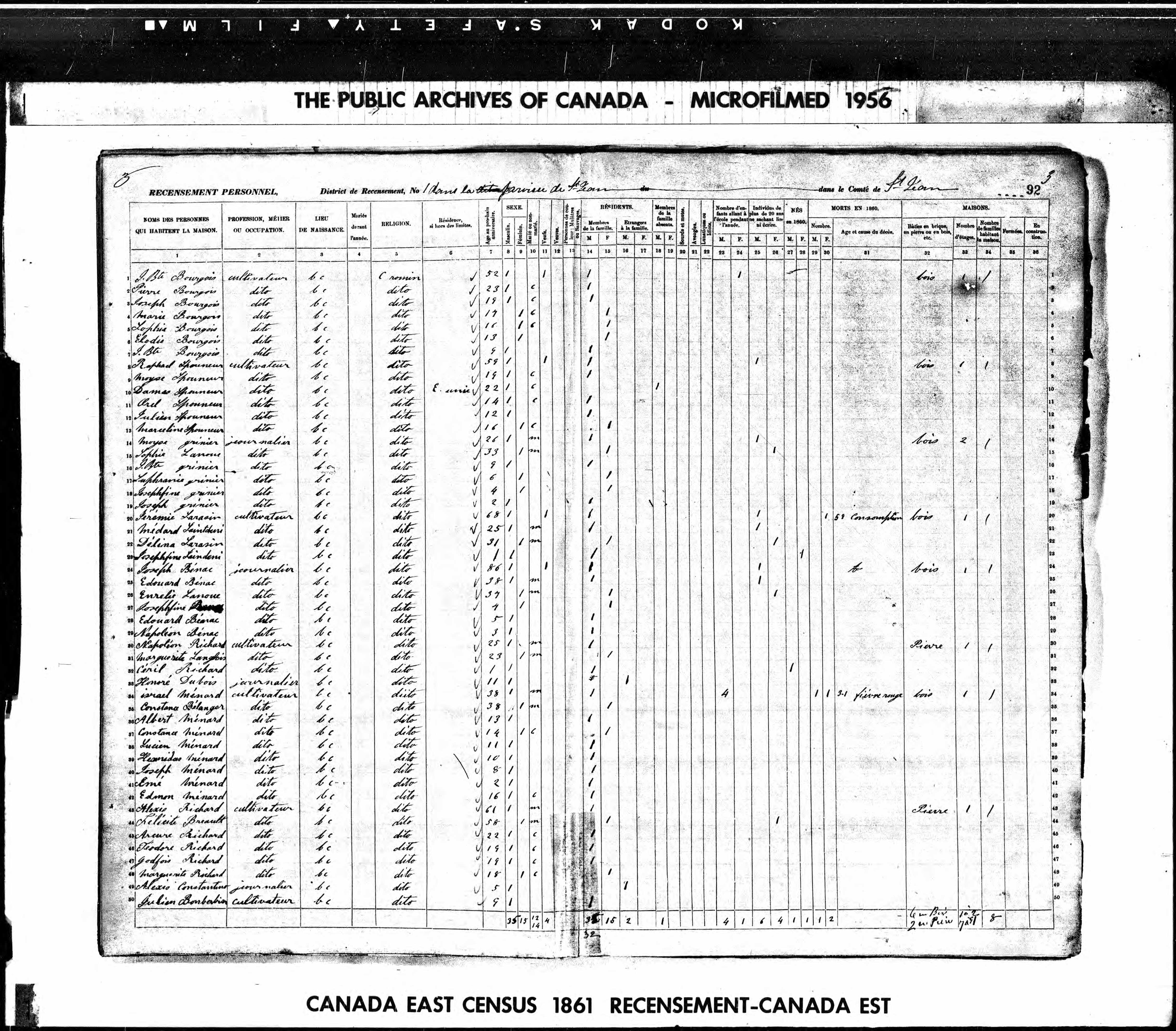 1861 Saint-Jean-sur-Richelieu : Famille du père de Israël Landry au recensement de 1861 à Saint-Jean-sur-Richelieu. Israël est absent. Je n'ai pas trouvé trace de lui tant dans le recensement au Québec qu'au Nouveau-Brunswick pour 1861. Il a alors 17 ans et est probablement aux études dans un collège ou on enseigne particulièrement la musique.