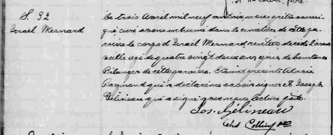 1906 Décès du père de Israël On note que son père est prénommé Israël. Décédé le 1e avril, sépulture le 3 avril 1906 à l'église de Saint-Jean-l'Évangéliste à Saint-Jean-sur-Richelieu.
