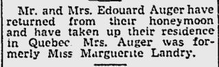 Le journal, The Gazette, Montréal, 16 juin 1941, page 16 Mariage de Marguerite Landry et Édouard Auger. Notez, mariage intime dans la chapelle de la basilique.