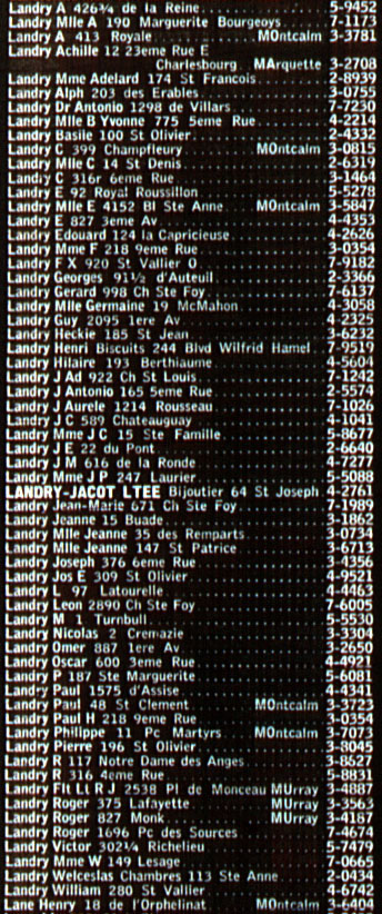 1. Antonio Landry #35151, naissance 3 aoû 1885 à St-Octave-de-Métis, Matane, QC,[1],[2] (voir note 1) (fils de Arthur Charles Landry #12807 et Caroline Ulpide Marceau #12808), baptême 3 aoû 1885 à St-Octave-de-Métis, (St-Octave), Matane, QC,[3] recensement 1901 à St-Octave-de-Métis, Matane, QC,1 recensement 1911 à Rivière-du-Loup, [Fraserville], QC,[4] résidence 1940 - 1945 à 54 rue St-Louis,[5] profession 1941 Docteur médecin-dentiste,3 résidence 1954 à 1298 Villars, Sillery, QC, décès 24 avr 1954 à Québec, QC.2 Baptisé, Joseph Arthur Antonio Landry. Antonin Landry au recensement de 1901. Il a marié Arthémise Desrochers #35157, marié(e) 27 fév 1911 à Montréal, (St-Louis-de-France), QC,[6] naissance .vs jan 1885,4 (fille de Jean Louis Desrochers #35158 et Georgiana Voyer #35159), recensement 1911 à Rivière-du-Loup, [Fraserville], QC.4 Enfant(s) : i. Marguerite Landry #35174, naissance 18 déc 1911 à Rivière-du-Loup, QC,2,3 (voir note 2), baptême 24 déc 1911 à Rivière-du-Loup, (St-Patrice), QC,3 profession 1941 Marchande,5 décès 15 avr 1958 à Québec, QC,2,[7] sépulture 19 avr 1958 à Charlesbourg, (Notre-Dame-des-Laurentides), QC. Baptisée et mariée sous Marie Marguerite Jeannine Landry. Elle a marié Édouard Auger #35175, marié(e) 1 jul 1941 à Québec, (Notre-Dame), QC,6,3 (voir note 3), naissance 29 avr 1907 à Montréal, QC,2,3 (voir note 4) (fils de Armand Gabriel Auger #35176 et Élisabeth Mary Denfall ou Dewfall #35177), résidence 1941 à 50 ave Laurier,5 profession 1941 Négociant,5 décès 20 fév 1992 à Lac-Beauport, QC.2 Édouard: Marié sous Marie Édouard Elzéar Jacques Auger. Décédé veuf de Marguerite Landry. ii. Yvette Landry #35190, naissance 12 jun 1913,2 décès 28 mar 1971 à Québec, QC.2 Elle a marié Harold Hyndman #35191, marié(e) 26 sep 1939 à Québec, (Notre-Dame), QC,6,3 (voir note 5), naissance 16 aoû 1911,2 (fils de James Cummingham Hyndman #35192 et Alice Maude Mahoney #35193), profession 1939 Assistant gérant International Harvester,3 décès 13 jun 1987 à Québec, QC.2 iii. Corinne Landry #35170, naissance 12 jan 1917,5,2 (voir note 6), décès 14 déc 1965 à Québec, QC.2 Elle a marié Douglas Power #35171, marié(e) 12 jan 1940 à Québec, (Notre-Dame), QC,6,5 naissance >vs1919,5 (voir note 7) (fils de Gérard Power #35172 et Marie Lafleur #35173), profession 1940 Militaire.5 iv. Madeleine Landry #35178, naissance >vs1919,5 (voir note 8), profession 1945 Sténo,5 résidence 1946 à Toronto, Ontario.[8] Elle a marié Paul Douglas #35179, marié(e) 24 fév 1945 à Québec, (Notre-Dame), QC,6 naissance >vs1916 à Ontario,5 (voir note 9) (fils de Donald Douglas #35180 et Nellie Hayden #35181), profession 1945 Lieutenant-d'Aviation,5 résidence 1946 à Toronto, Ontario.8 Note 1 Au décès 4 août 1884. Note 2 30 ans au mariage. Note 3 L'époux de St-Coeur-de-Marie de Québec. Note 4 34 ans au mariage. Note 5 Dispense pour non catholique. Les parents des deux mariés sont absents. Note 6 23 ans au mariage. Note 7 21 ans au mariage. Note 8 26 ans au mariage. Note 9 29 ans au mariage.