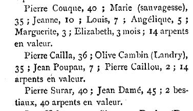Pierre Cailla 36 ans 14 arpents Ollive Landri 35 ans Jean poupau 7 Pierre