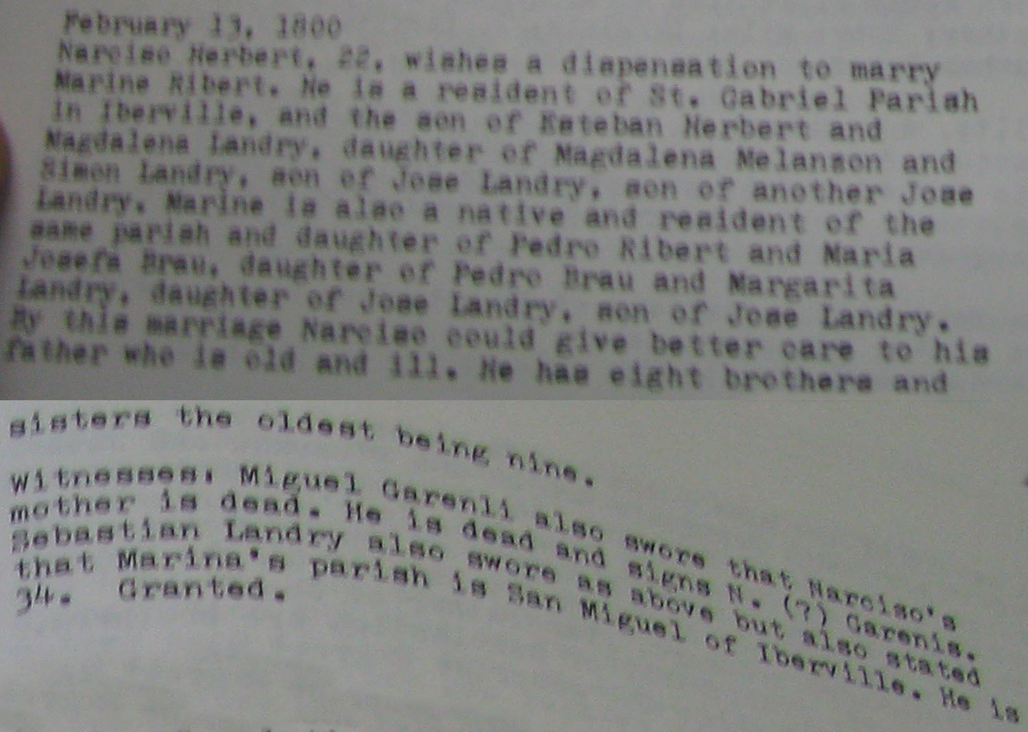 Landry disant que la aproisse de Marina (sic) est San Miguel d'Iberville. |