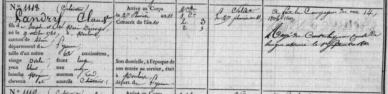 106e régiment d'infanterie de ligne, juillet 1806-11 novembre 1806 (matricules 1 à 2 976).SHD/GR 21 YC 773 Claude Landry fils de Joseph et Marie Denoyer né le 09 octobre 1780 à Moulins(?), Yonne, Matricule 1118
