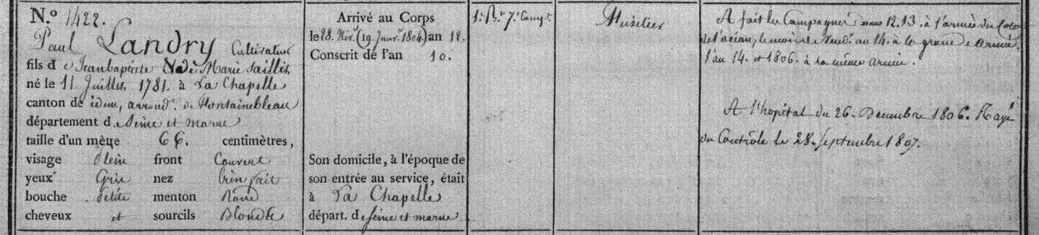 Pierre Paul Jean Landry fils de Jean Baptiste et Marie Sayde né le 11 juillet 1782 à Chapelle-la-Reine, Seine-et-Marne, Matricule 1422