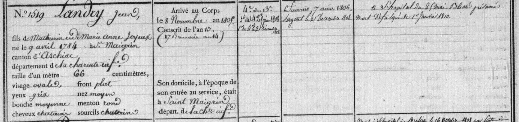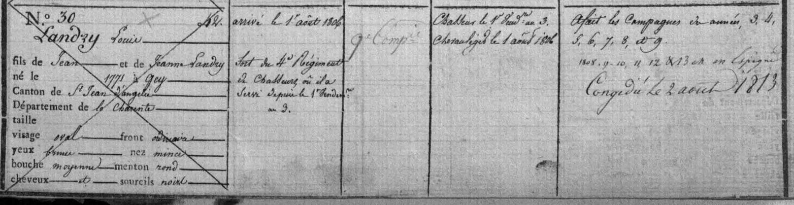 Louis Landry fils de Jean et Jeanne Landry né le 1771 à Gey, Charente, Matricule 42