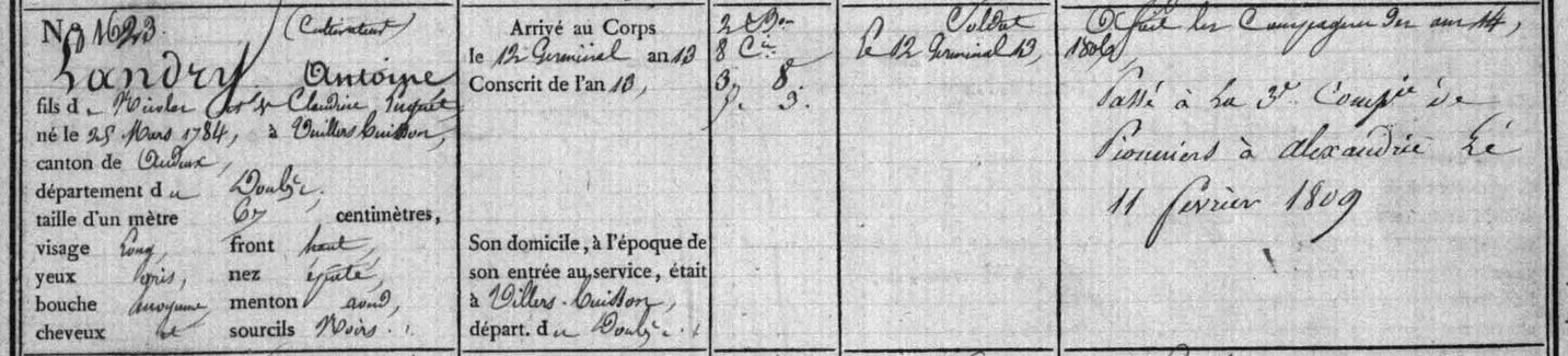 Antoine Landry fils de Nicolas et Claudine Luguet né le 25 mars 1784 à Villers Buisson ? Buzon, Doubs, Matricule 1623