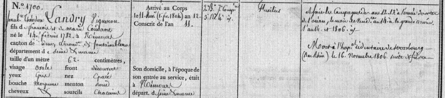 Jean Baptiste Théodore Landry fils de François et Marie Coudant né le 14 février 1782 à Nemours , Seine-et-Marne, Matricule 1700
