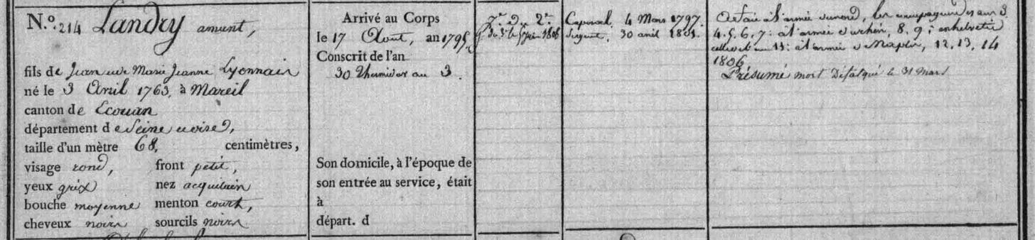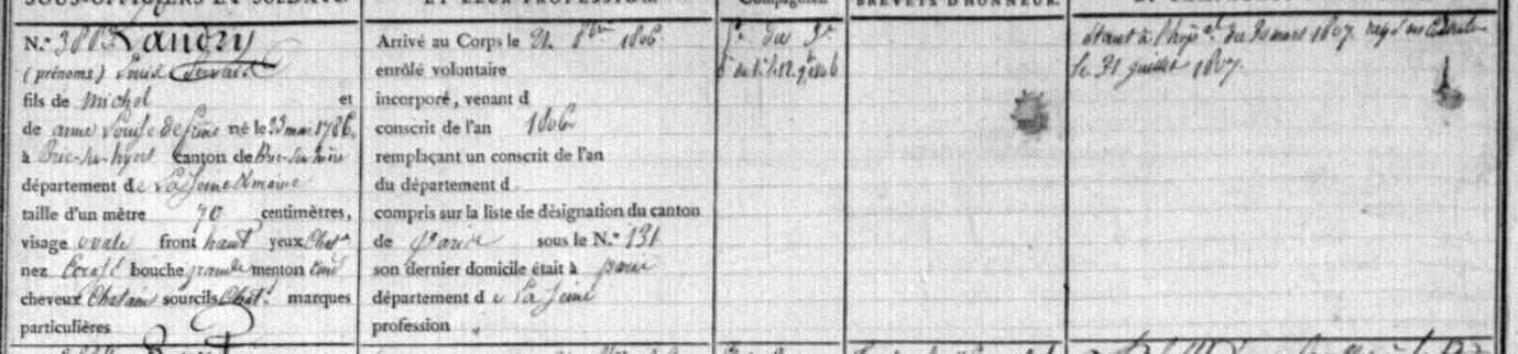 Louis Landry fils de Michel et Jeanne Louise Dufresne né le 23 mai 1786 à Brie-Comte-Robert, Seine et Marne, Matricule 3883