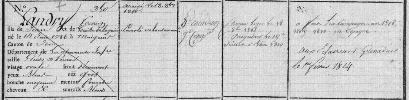 Firmin Landry fils de Jean et Louise Pelegrin né le 14 juin 1786 à Maigrint, Charente Inférieure (Maritime), Matricule 350